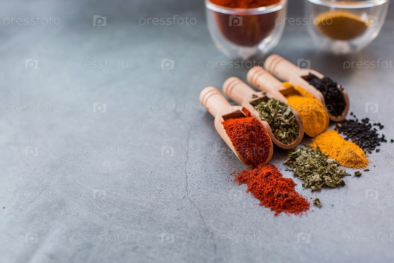 Набор ароматных специй. Куркума, паприка, травы и перец в деревянных ложках на сером фоне. Свободное место для текста