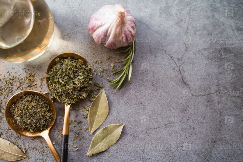 Ароматные специи. Сушеная петрушка, укроп, розмарин, чеснок, лавровый лист и бутылка масла на сером фоне. Свободное место