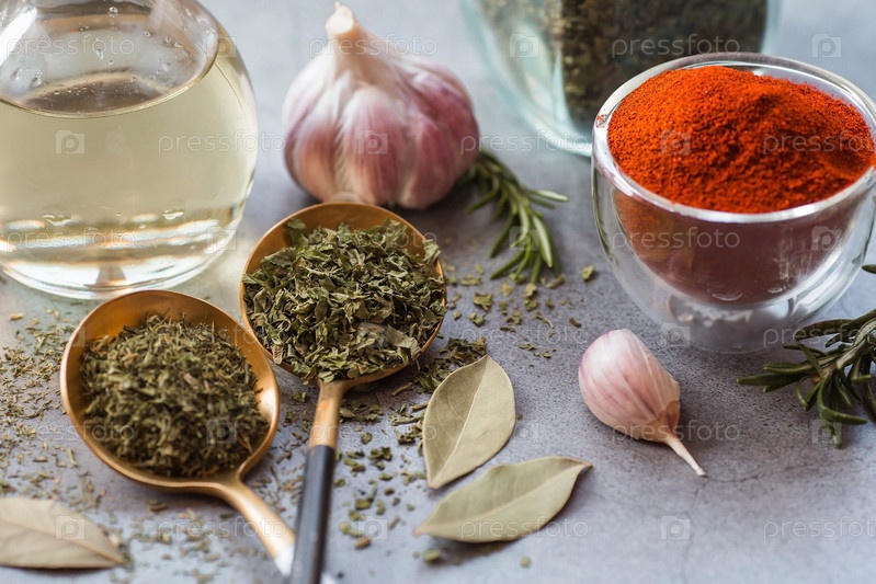 Ароматные специи. Сушеная петрушка, укроп, паприка, розмарин, чеснок, лавровый лист и бутылка масла на сером фоне. Свободное место