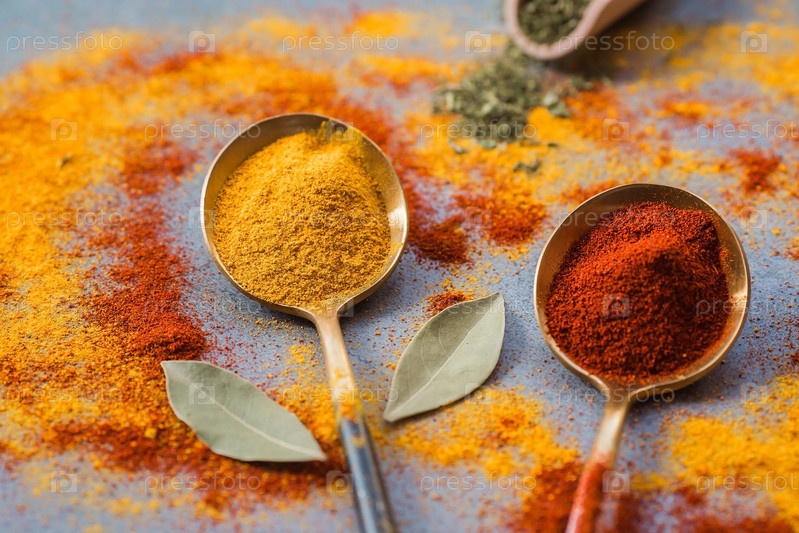 Набор ароматных специй. Куркума и паприка в железных ложках на сером фоне. Свободное место для текста