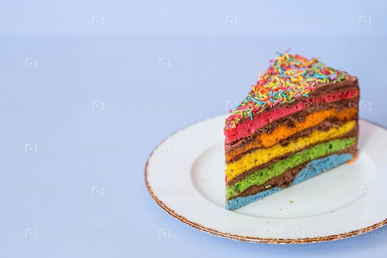 Радужный праздничный торт, украшенный праздничной свечой и конфетти. Кондитерские изделия. Разноцветный десерт цвета радуги на голубом фоне