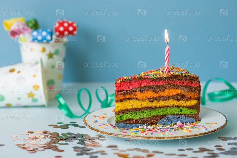 Радужный праздничный торт, украшенный праздничной свечой и конфетти. Кондитерские изделия. Разноцветный десерт цвета радуги на голубом фоне