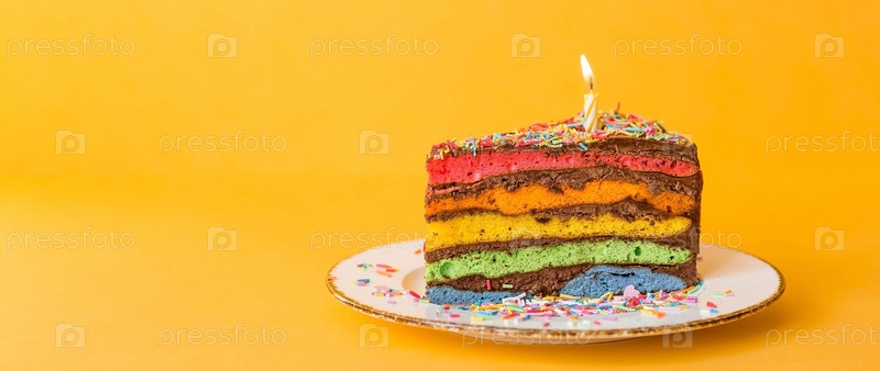 Радужный праздничный торт, украшенный праздничной свечой и конфетти. Кондитерские изделия. Разноцветный десерт цвета радуги на желтом фоне