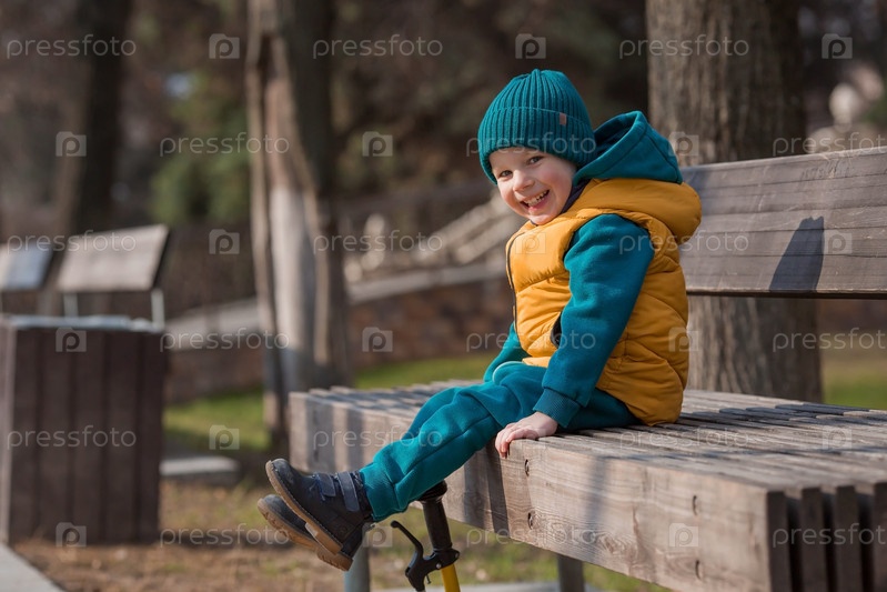 Весной на детской площадке гуляет маленький мальчик. Ребенок сидит на скамейке на свежем воздухе в солнечный весенний день. Детство и развитие ребенка