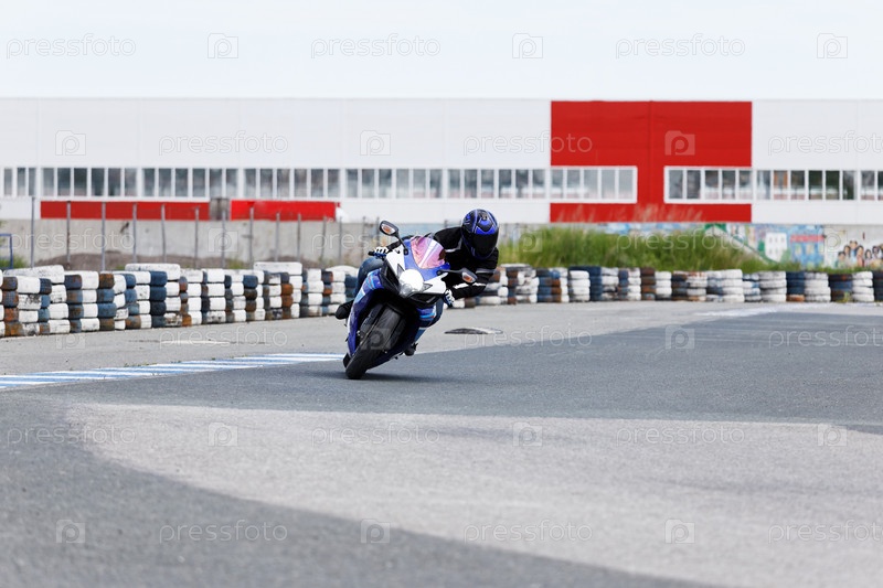 Мотоциклетная практика, наклоняясь в быстрый поворот на трассе