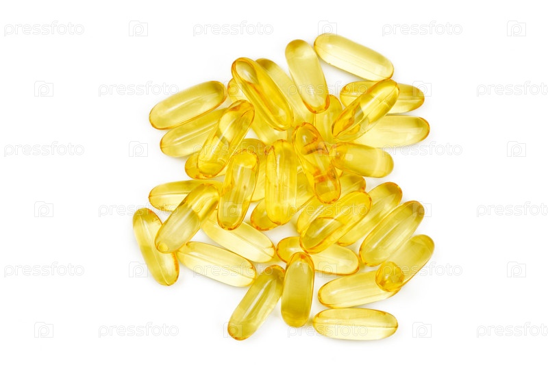 Крупный план капсул рыбьего жира с омега-3 на белом фоне. Вид сверху