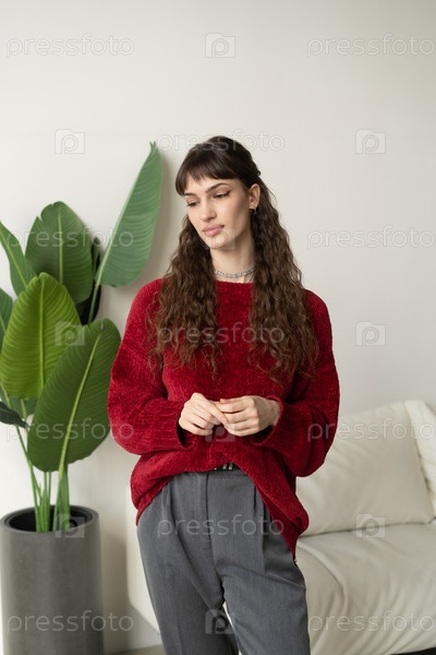 Молодая красивая женщина позирует в красном свитере в студии