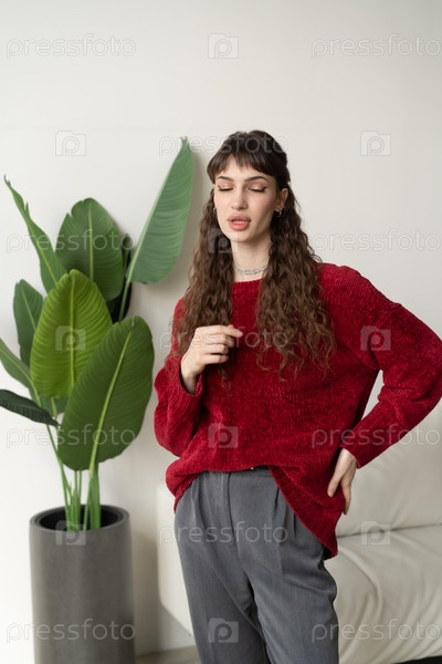 Молодая красивая женщина позирует в красном свитере в студии