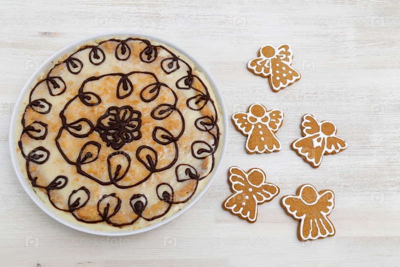 Пряники в форме ангела и домашний чизкейк на белом деревянном столе