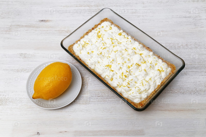 Английский десерт баноффи с бананами, карамельным соусом и взбитыми сливками в стеклянной форме на белом деревянном столе