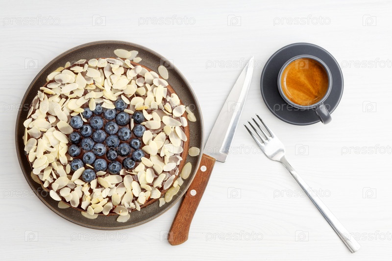 Домашний шоколадный чизкейк с ломтиками миндаля на белом деревянном столе. Вид сверху