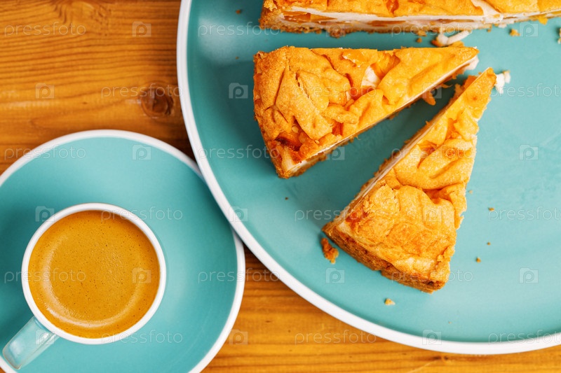 Крупный план домашний пирог с нектаринами и чашкой кофе эспрессо на деревянном столе. Вид сверху
