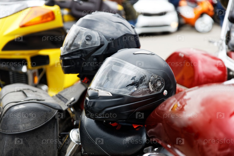 Мотоциклетные шлемы лежат на сиденьях мотоциклов