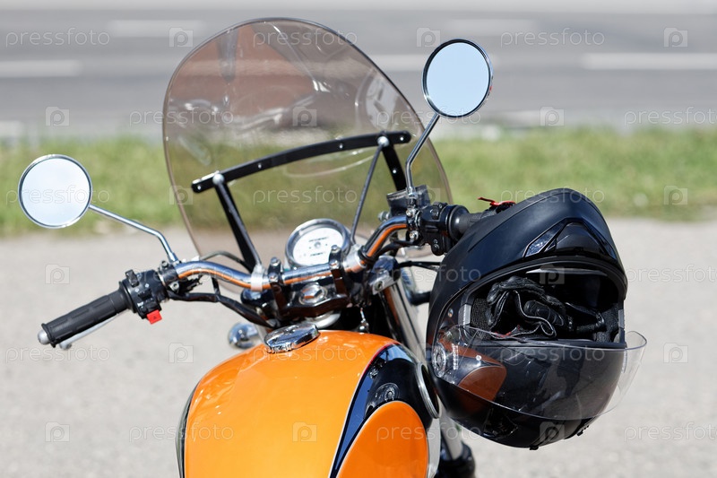 Черный мотоциклетный шлем на руле мотоцикла на размытом фоне. Мелкий фокус