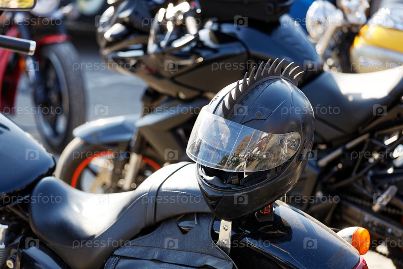 Черный мотошлем крупным планом на руле мотоцикла и мотоциклах на размытом фоне