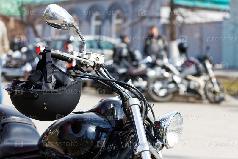 Черный мотошлем крупным планом на руле мотоцикла на размытом фоне