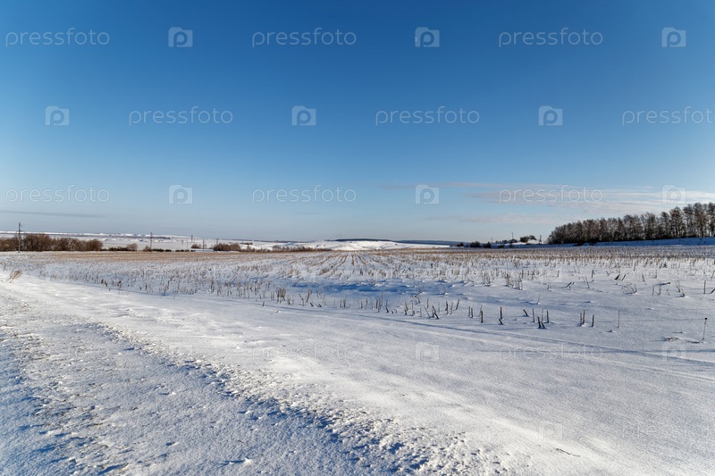 Зимний снежный пейзаж. Поле и деревья на расстоянии далеко