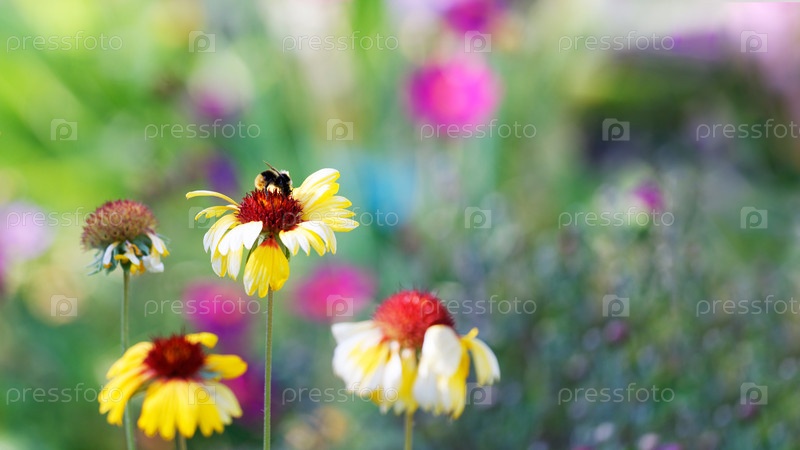 Пчела на весеннем цветке на фоне размытых цветов. Мелкий фокус