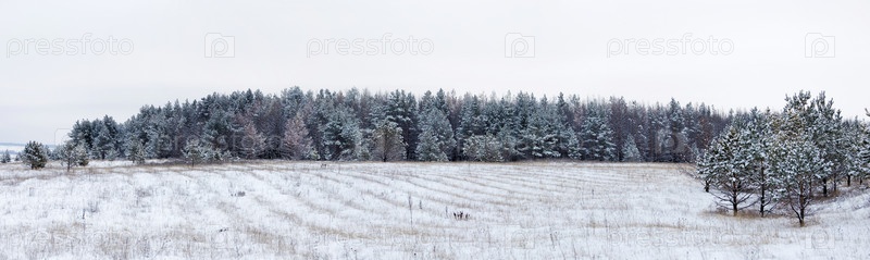 Зимний пейзаж. Панорамный снимок заснеженного поля и леса вдалеке