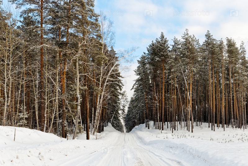 Снежная проселочная дорога через зимний лес