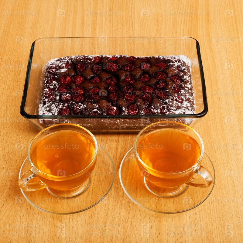 Две чашки чая и брауни - шоколадный пирог с вишней
