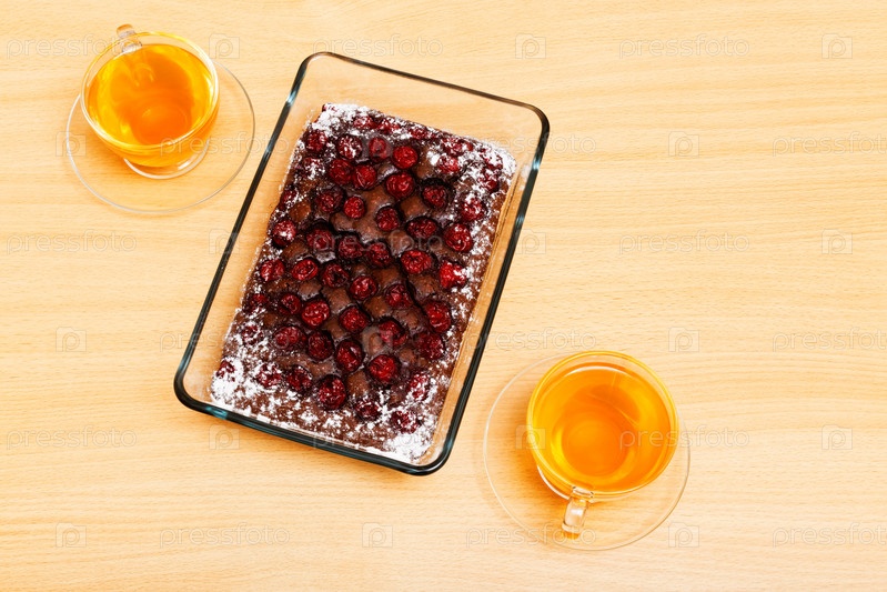 Две чашки чая и шоколадный пирог с вишней на деревянном столе