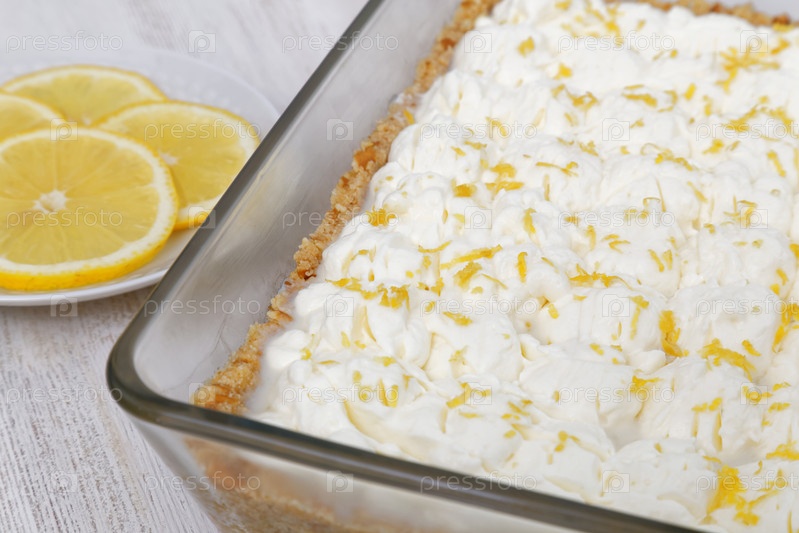 Английский десерт баноффи с бананами, карамельным соусом и взбитыми сливками в стеклянной форме и нарезанным лимоном на белом деревянном столе. Выборочный фокус
