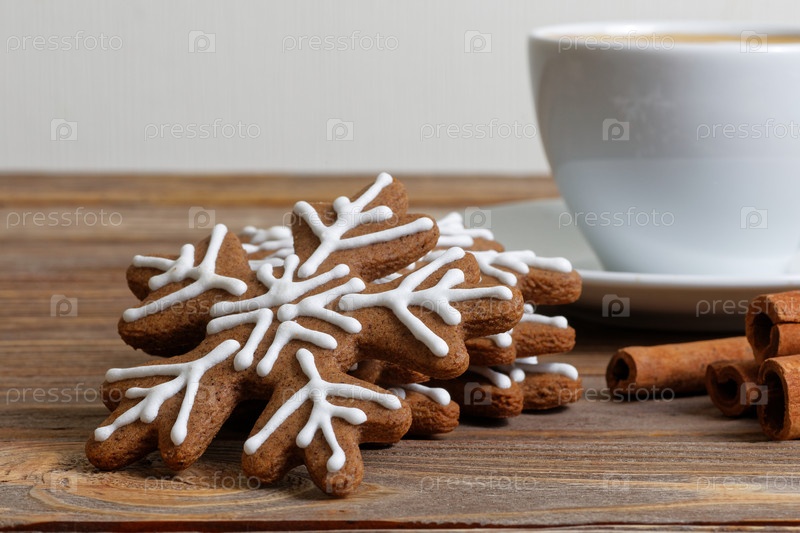 Пряники крупным планом, корица и чашка кофе