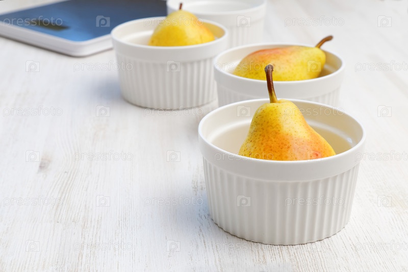 Груши на белых керамических формах для выпечки, приготовленные для выпечки кексов на белом деревянном столе. Мелкий фокус
