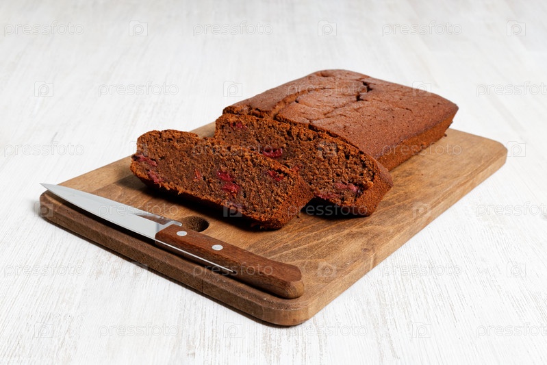 Домашний шоколадный торт с красным вином и вишней и два ломтика на белом деревянном столе. Мелкий фокус