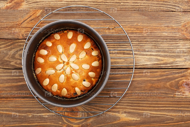 Домашний шоколадный чизкейк с ломтиками миндаля на белом деревянном столе. Вид сверху