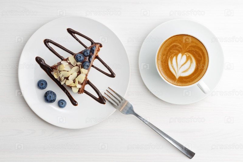 Домашний шоколадный чизкейк с ломтиками миндаля на белом деревянном столе. Вид сверху