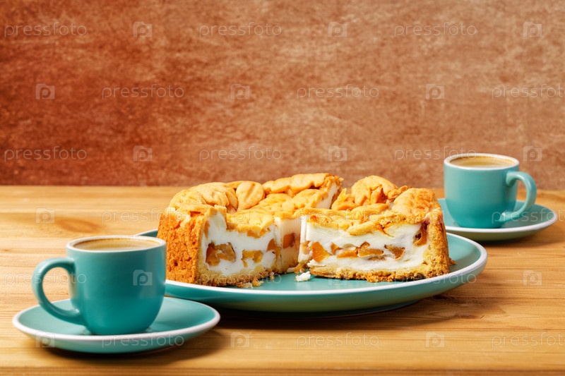 Домашний пирог с нектаринами и две чашки кофе эспрессо на деревянном столе. Копипространство