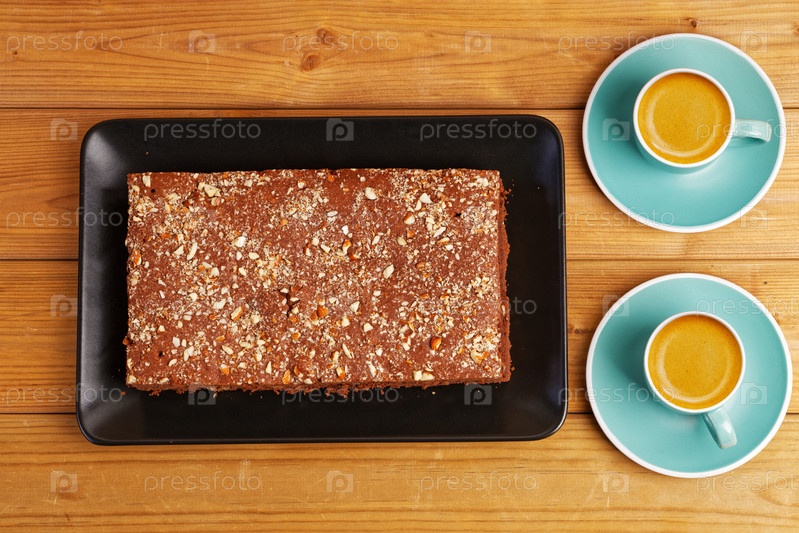 Домашний шоколадный торт и две чашки кофе эспрессо на деревянном столе. Вид сверху