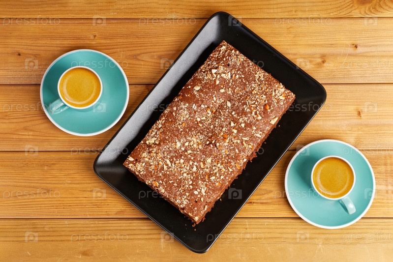 Домашний шоколадный торт и две чашки кофе эспрессо на деревянном столе. Вид сверху