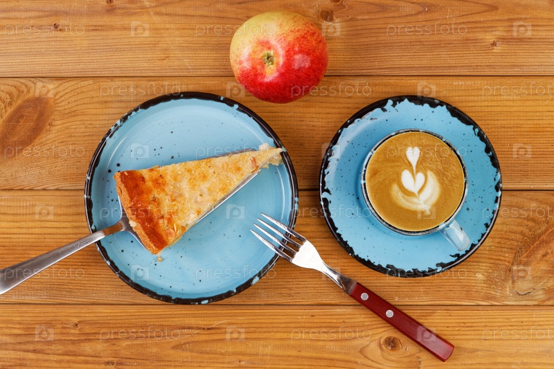 Кусок яблочного пирога и чашка кофе капучино на деревянном столе. Вид сверху