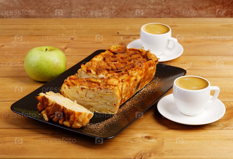 Французский яблочный пирог. Домашний яблочный клафути и две чашки кофе на деревянном столе. Мелкий фокус