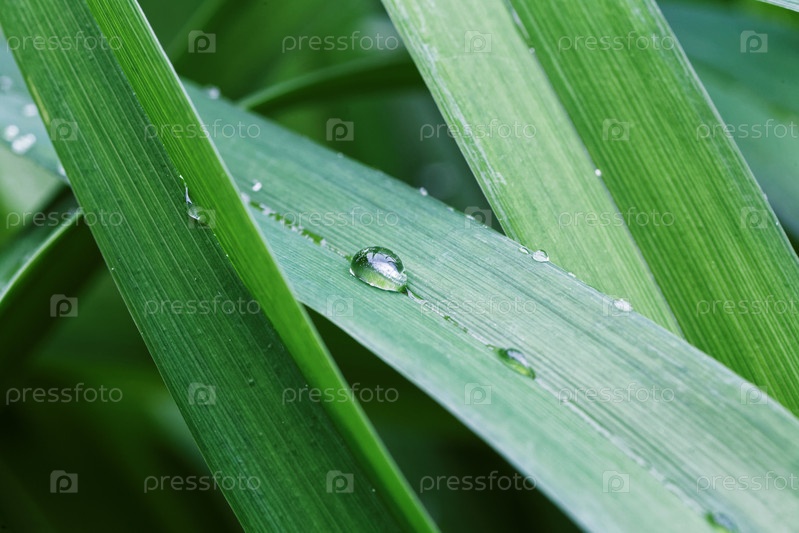 Листья зеленой травы крупным планом с каплями