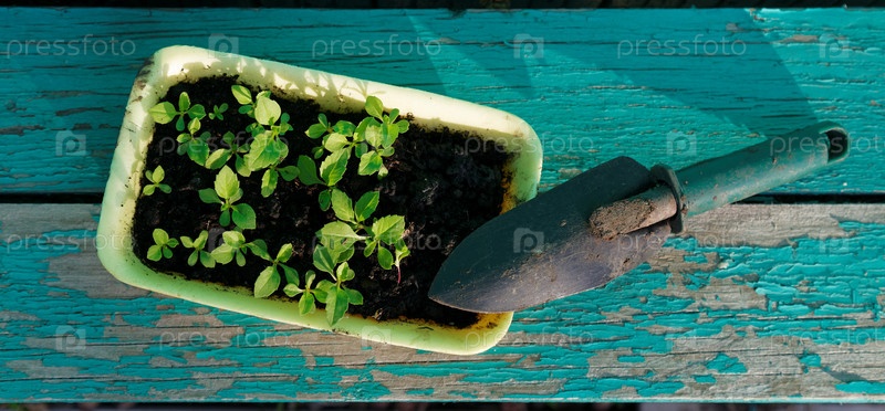 Маленькие зеленые ростки и небольшой садовый инструмент на потрепанном деревянном фоне
