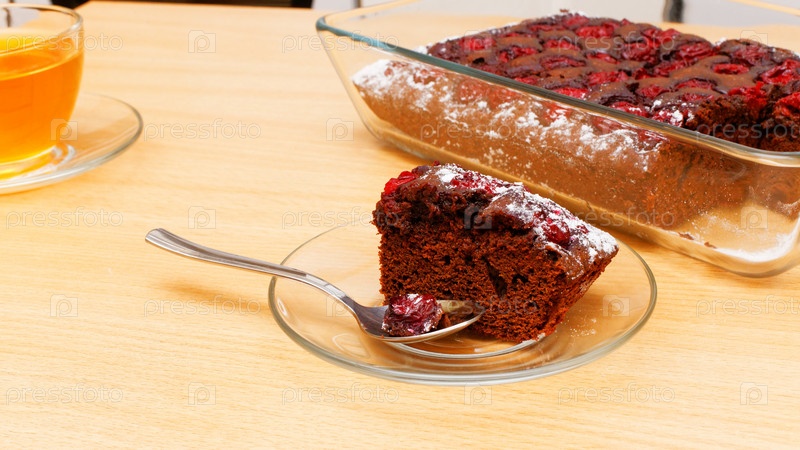 Кусок шоколадного торта с вишней и чашкой чая