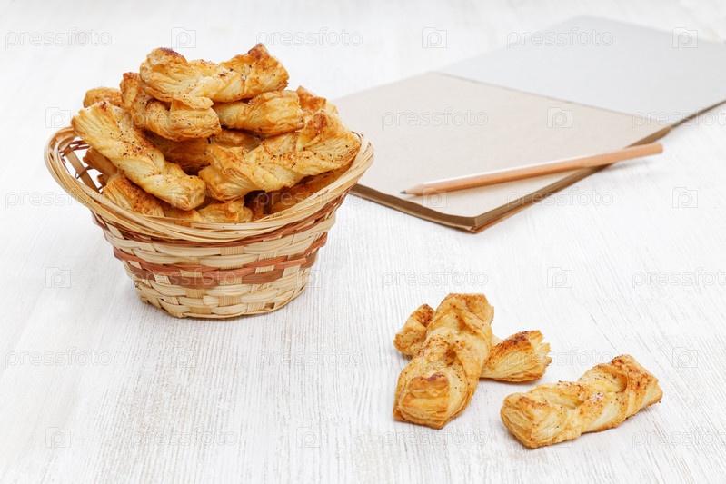 Плетеное печенье. Слоеное тесто с корицей рядом с блокнотом для рецептов и карандашом на белом деревянном столе. Мелкий фокус