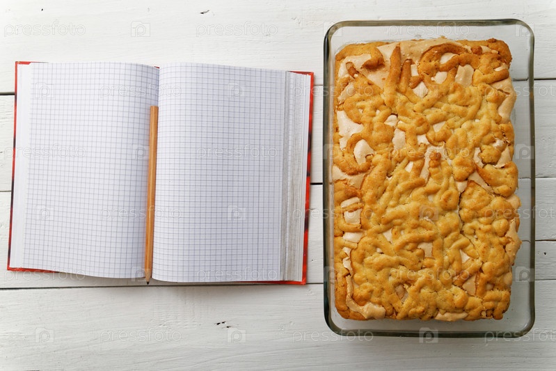 Песочный торт с лимонно-апельсиновой начинкой и безе рядом с блокнотом для рецептов на белом деревянном столе. Вид сверху