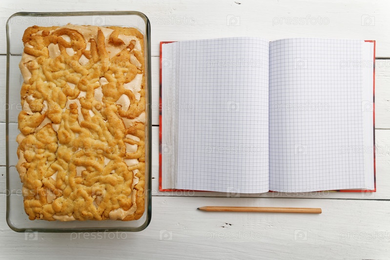 Песочный торт с лимонно-апельсиновой начинкой и безе рядом с блокнотом для рецептов на белом деревянном столе. Вид сверху