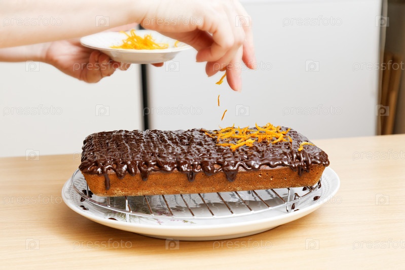 Шеф-повар украшает испеченный торт шоколадной и апельсиновой стружкой
