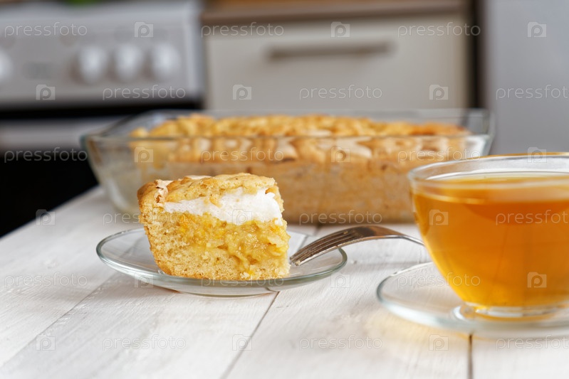Кусочек торта с лимонно-апельсиновой начинкой и безе на домашней кухне. Мелкий фокус