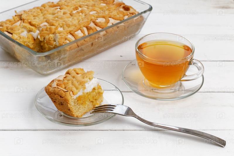 Кусок торта с лимонно-апельсиновой начинкой и безе возле чашки чая на домашней кухне