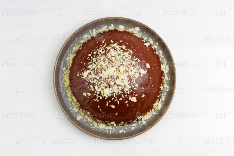 Домашний шоколадный чизкейк с ломтиками миндаля на белом деревянном столе. Вид сверху