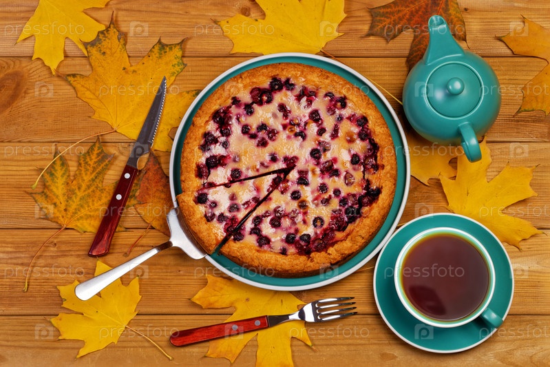Домашний ягодный пирог и чашка чая на деревянном столе. Вид сверху