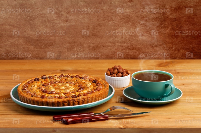 Домашний пирог, украшенный фундуком и чашкой чая на деревянном столе. Копипространство
