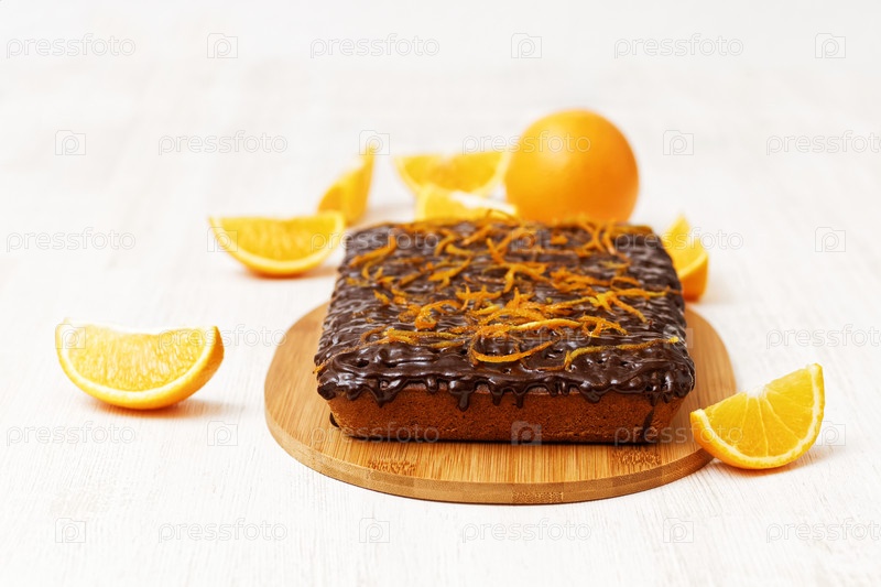 Шоколадно-апельсиновый торт с апельсиновой цедрой на белом деревянном фоне. Мелкий фокус